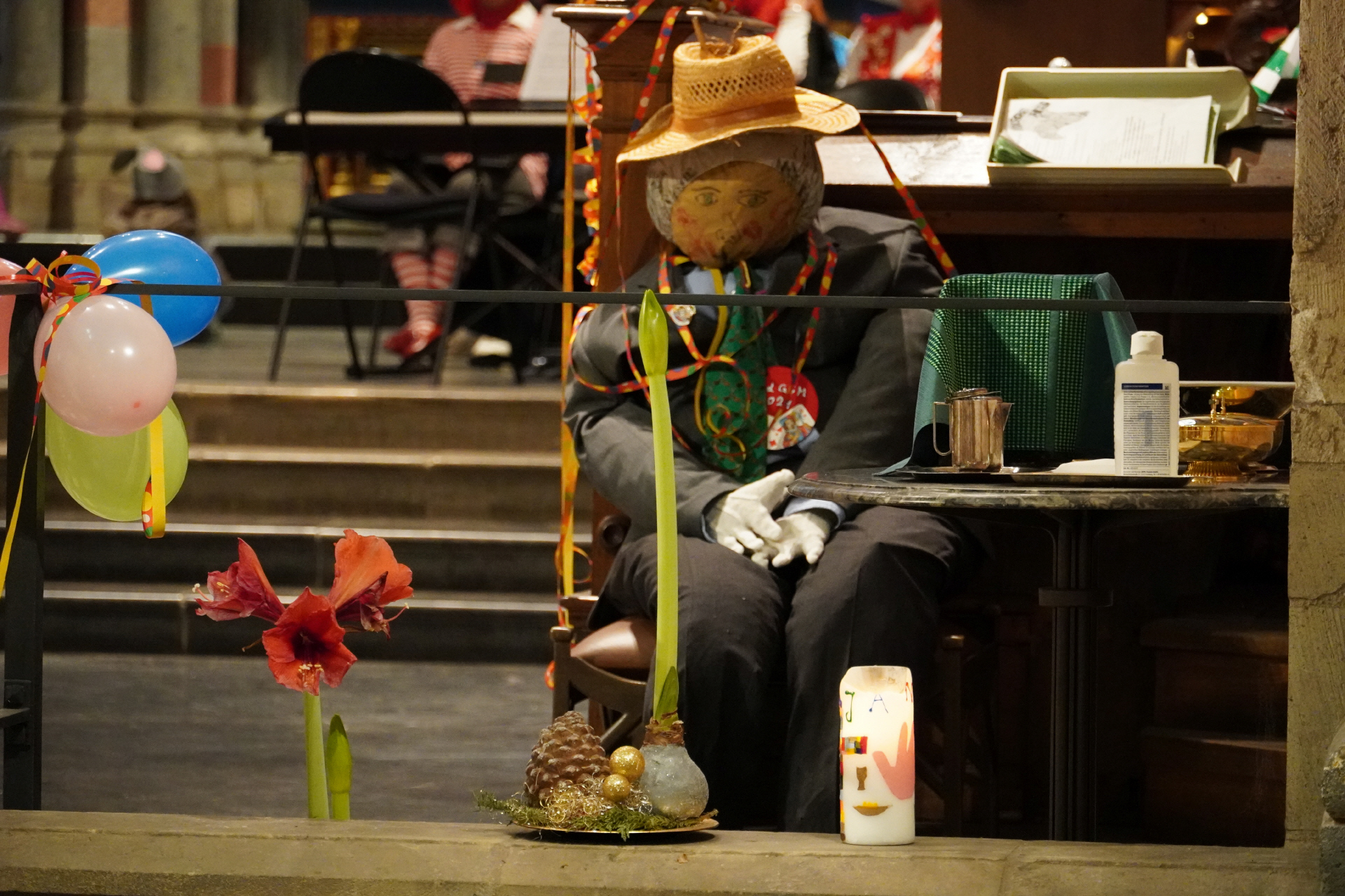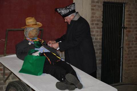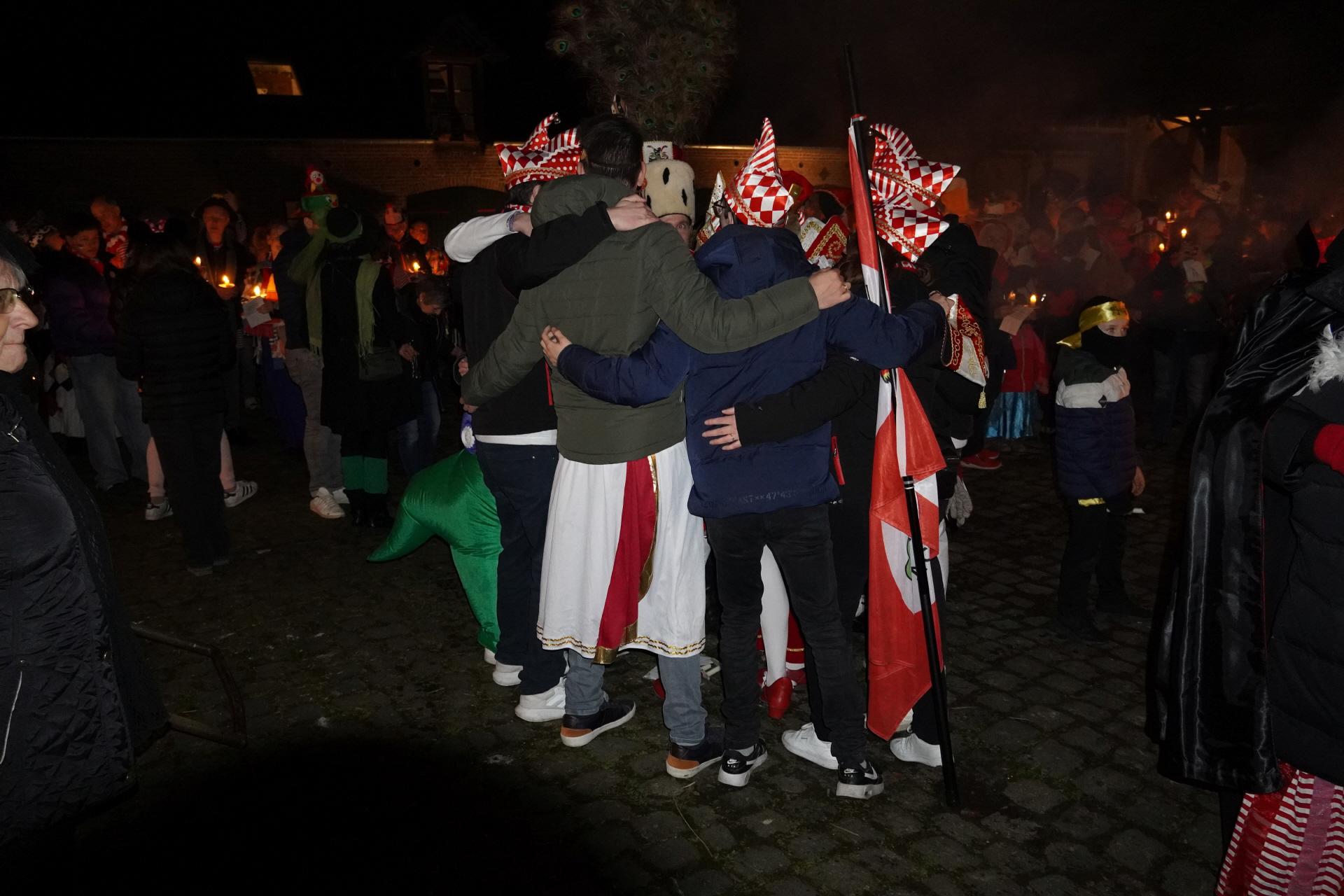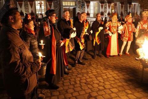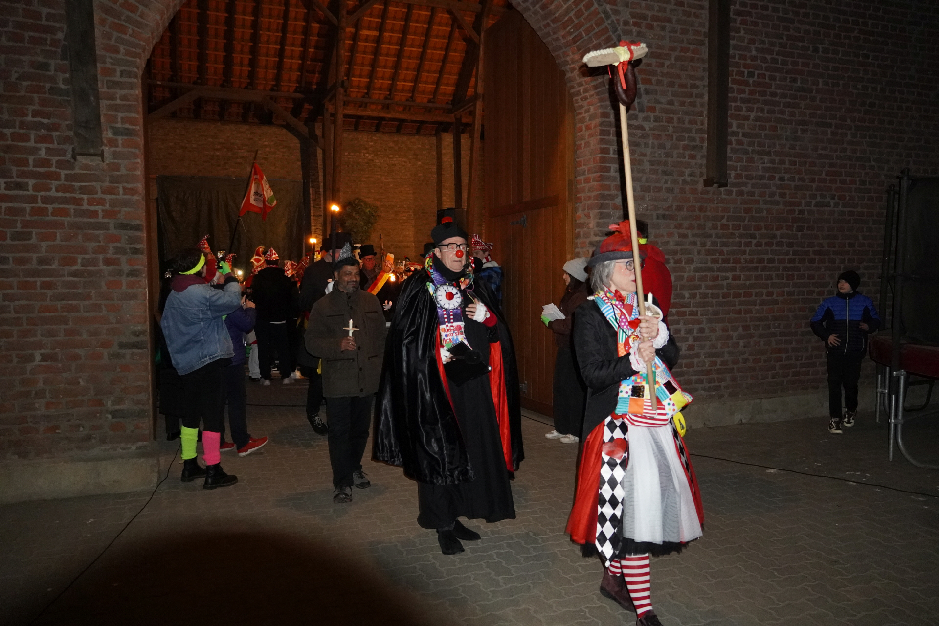 Bei der elften Nubbelverbrennung am 13. Februar 2024 auf dem Fronhof in Sinthern bei Familie Meller, diesmal wieder mit dem unvergleichlichen und gesunden "Zelebranten" Pfarrer Peter Cryan und wieder sehr zahlreichen Freunden des Sintherner Nubbels, einschließlich dem Geyener Dreigestirn als Ehrengäste.